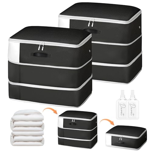 DIMJ Duvet Storage Compression Organiser Bags - 2 Pack 3-Layer Ultra Space Saving Self Compression Organiser with Clear Window, Washable Compression Bags for Comforters Bedding Moving Bags Dorm, Black