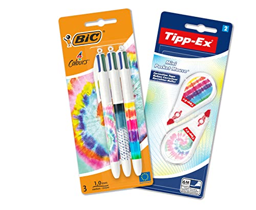 BIC Tie Dye Desk Set with BIC 4 Colours Decor Tie Dye Ball Pens and Mini Pocket Mouse Decors Correction Tapes - Assorted Designs, Bundle of 3+2