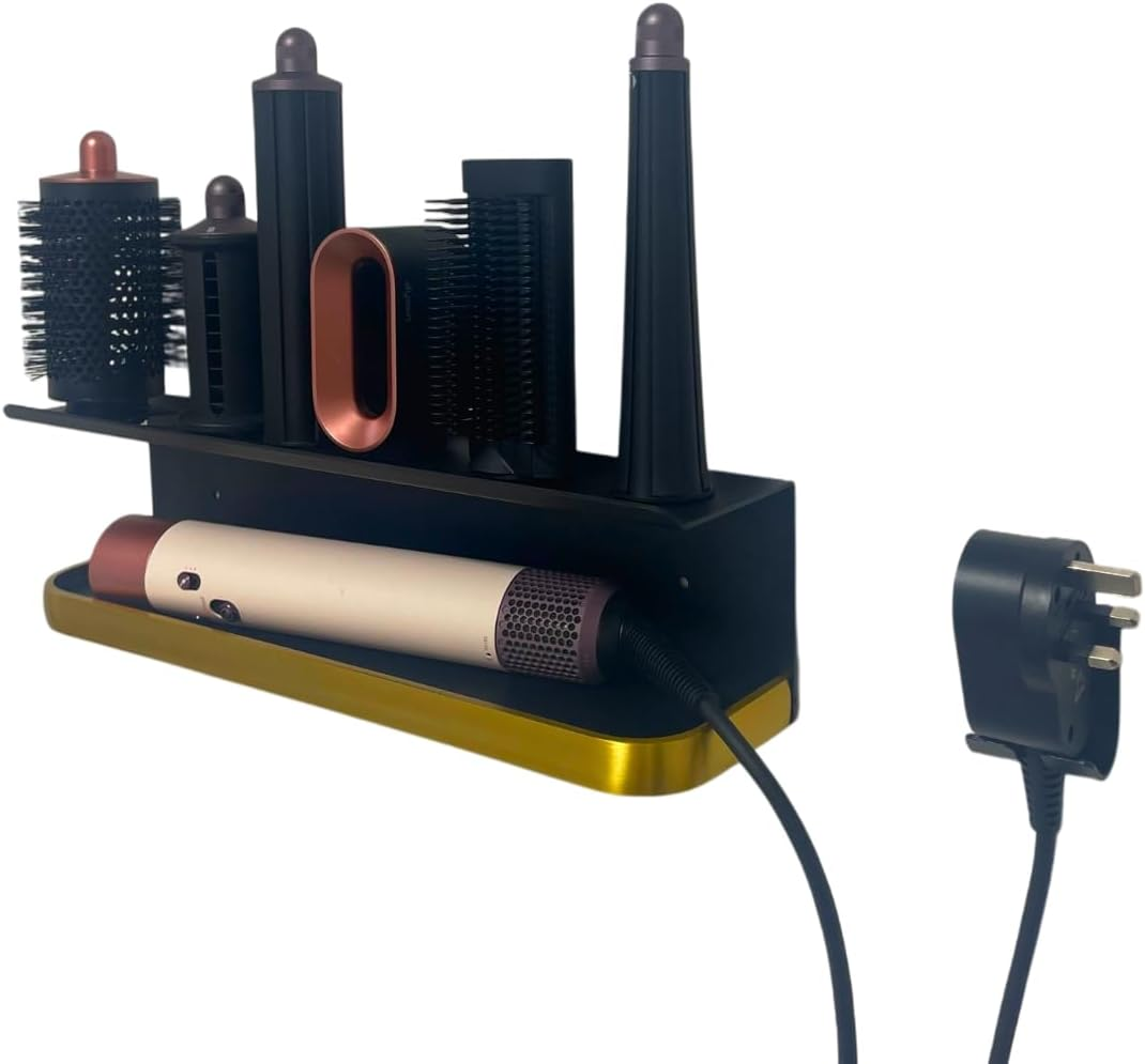 Yimerlen Straightener Holder Compatible with Dyson Airwrap Wall Mount Storage Rack for Curling Iron Attachments and Complete Styler (Gold/Black, with Air Cushion Comb)