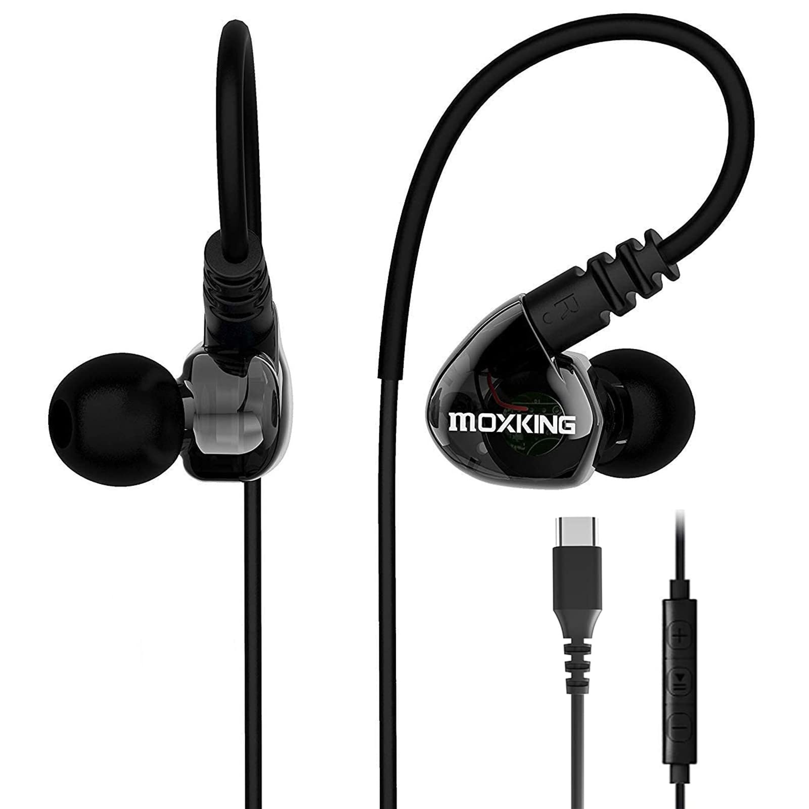 MOXKING USB C Running Sports Earbud, Type C Headphones Wired SML, BLACK-TypeC