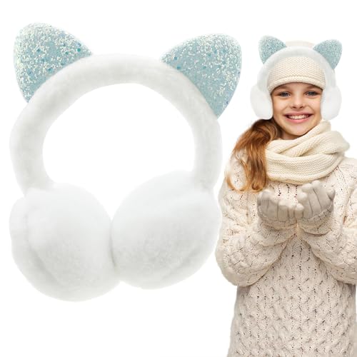Auswalar Winter Cold-proof Plush Earmuffs for Girls Women,Winter Warm Faux Furry White Cute Sequin Cat Ear Warmers Anti-Cold Adjustable Comfortable Ear Covers for Keep Ears Warm In Cold Weather