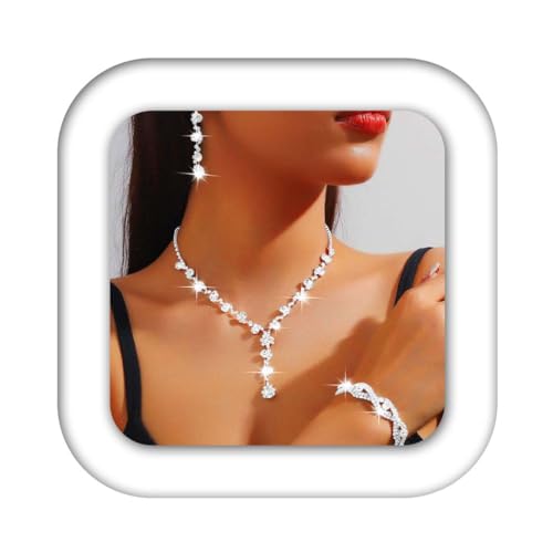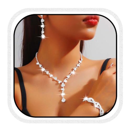 Reaky Bridal Jewelry Set Silver Rhinestone Necklace Sets Sparkly Earring and Necklaces 3 Pcs Bride Wedding Jewellery for Women (Silver)