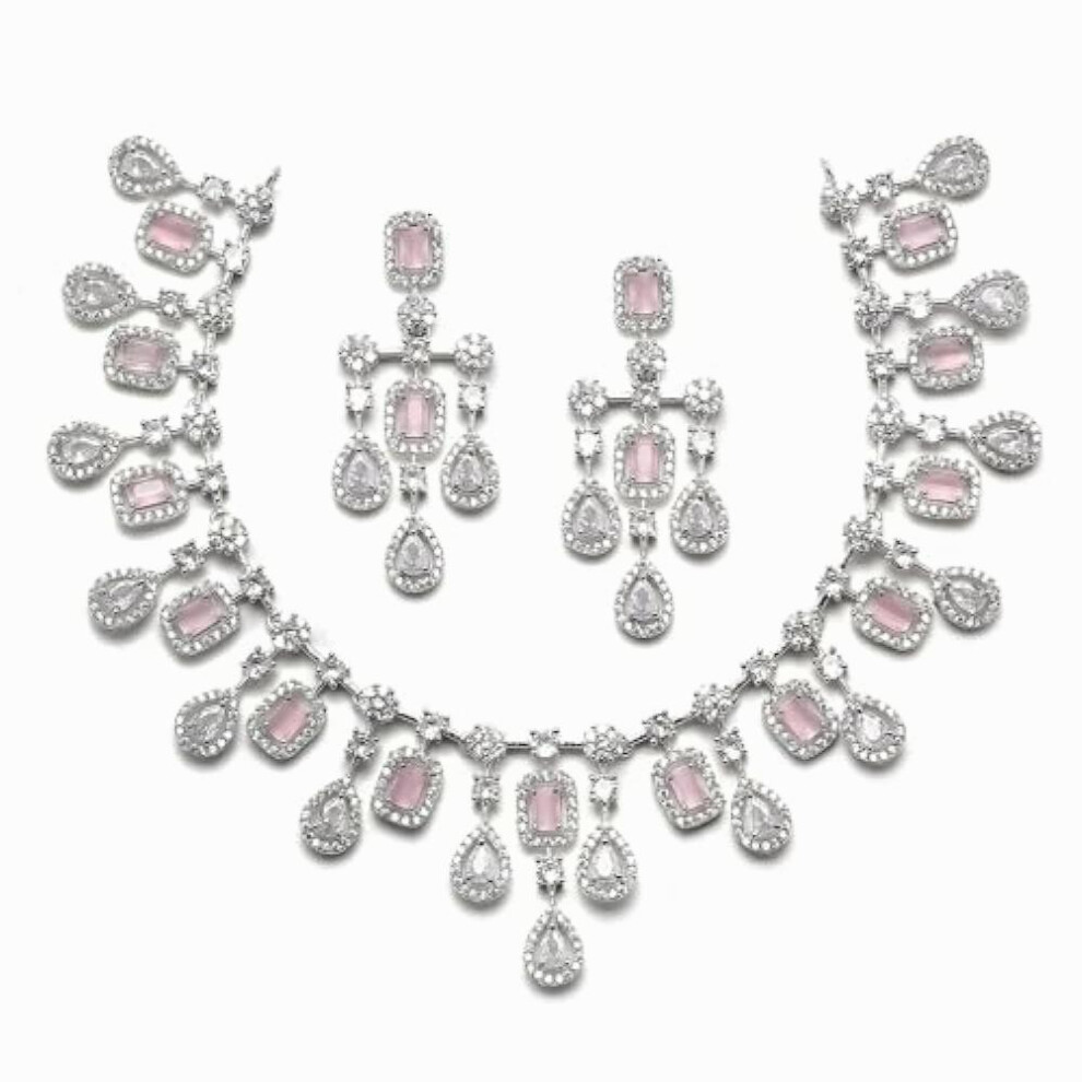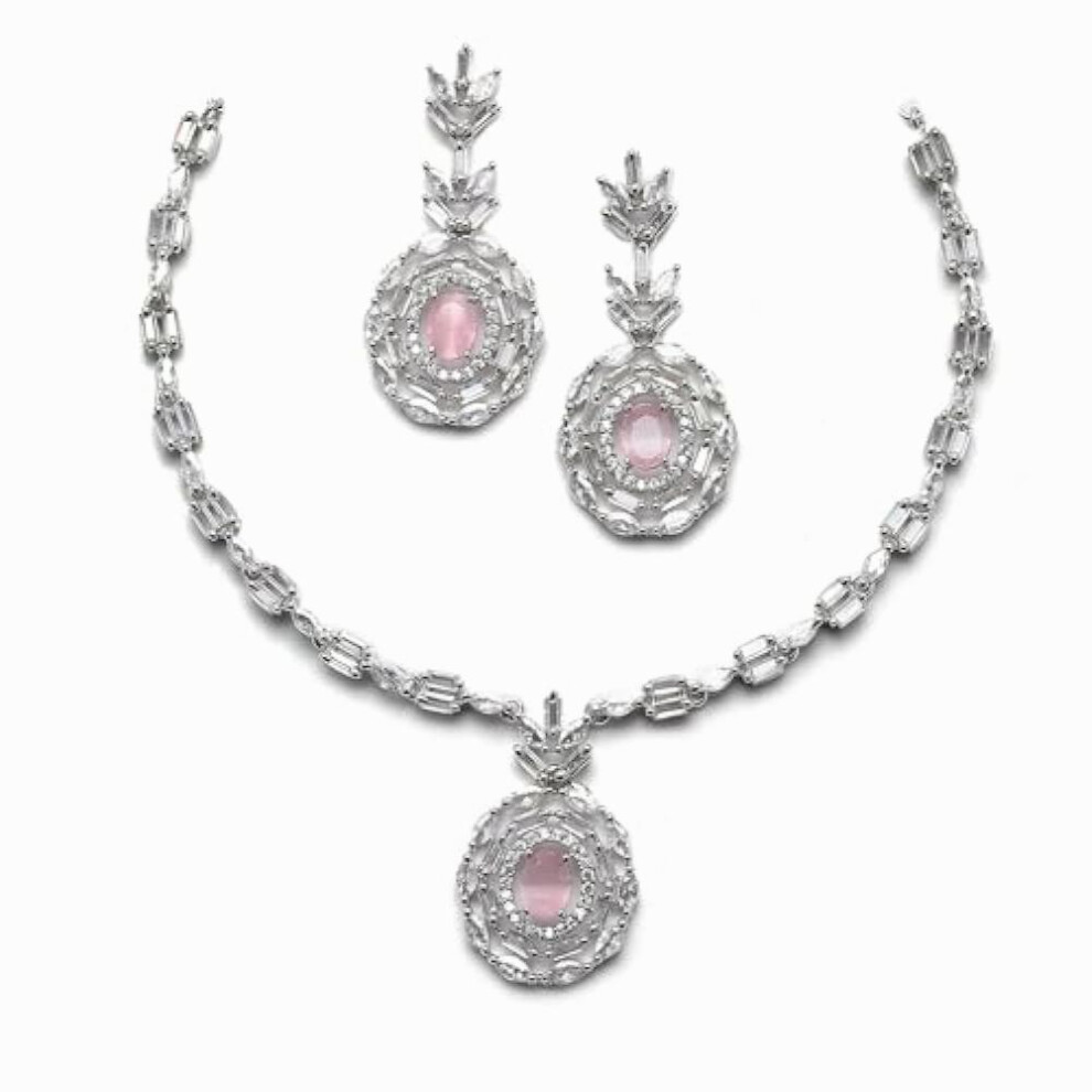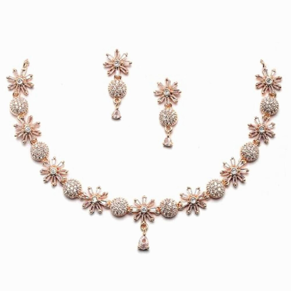 Rhodium Plated Silver Toned American Diamond Studded Necklace With Earring Jewellery Set For Woment and (Rose Gold)