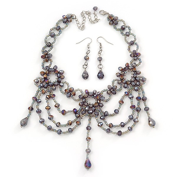 Lavender Glass Bead Gothic Costume Choker Necklace And Earring Set In Silver