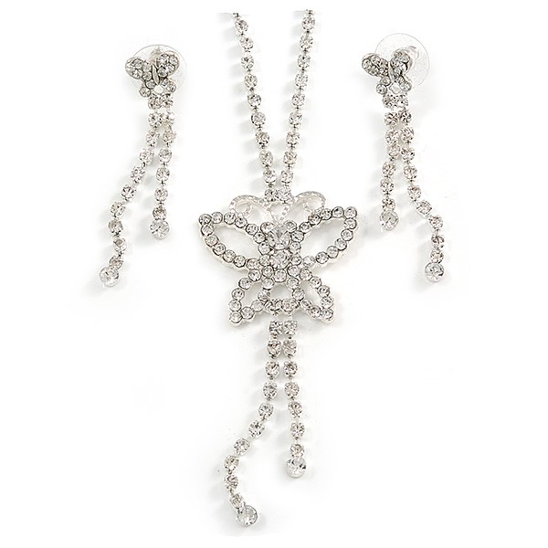 Clear Crystal Butterfly Necklace And Earring Set (Silver Tone)