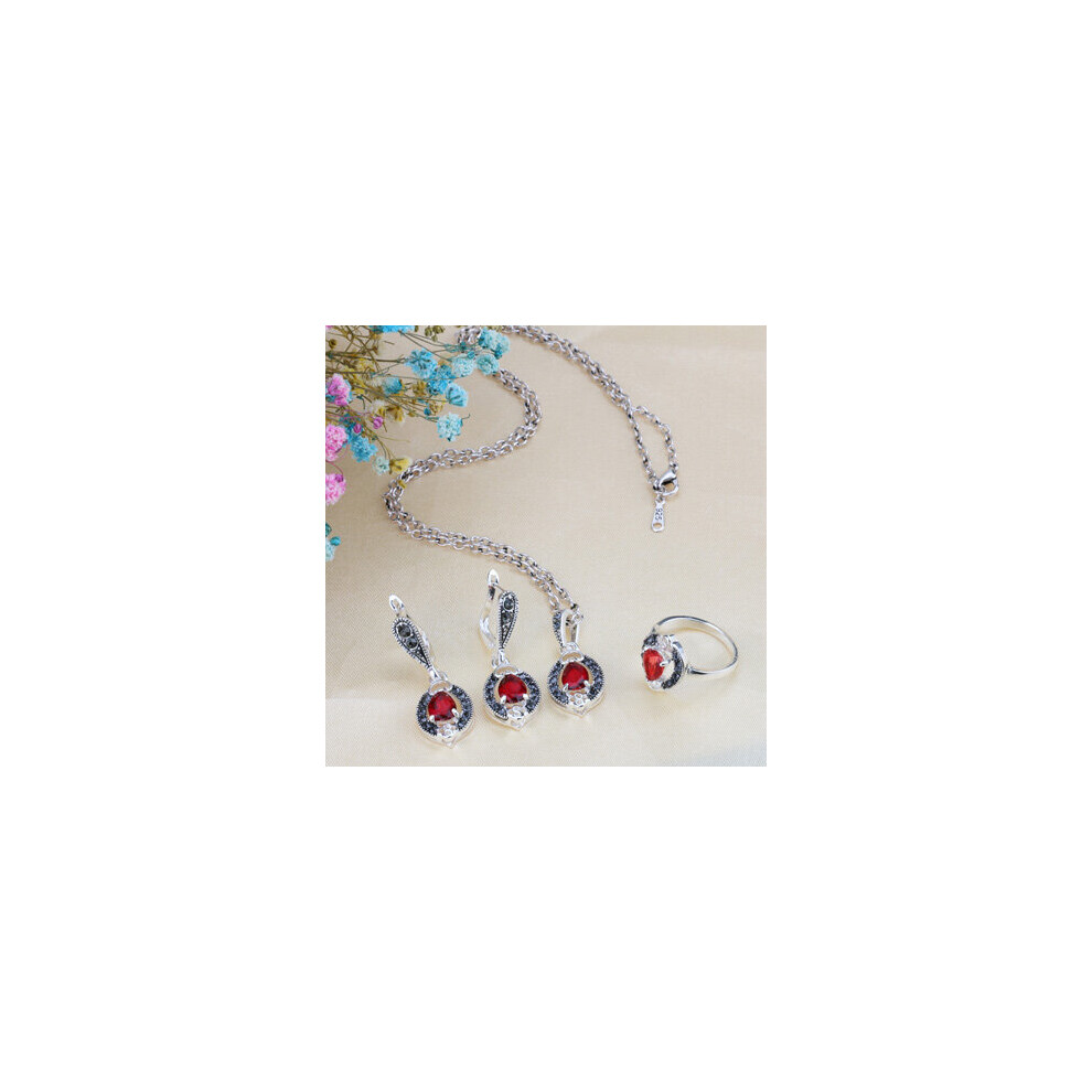 (Silver Plated, 7) Kinel Women's Silver Pendant Necklace And Earring Ring Retro Jewelry Set Red Zircon Love Heart Bridal Jewelry Sets