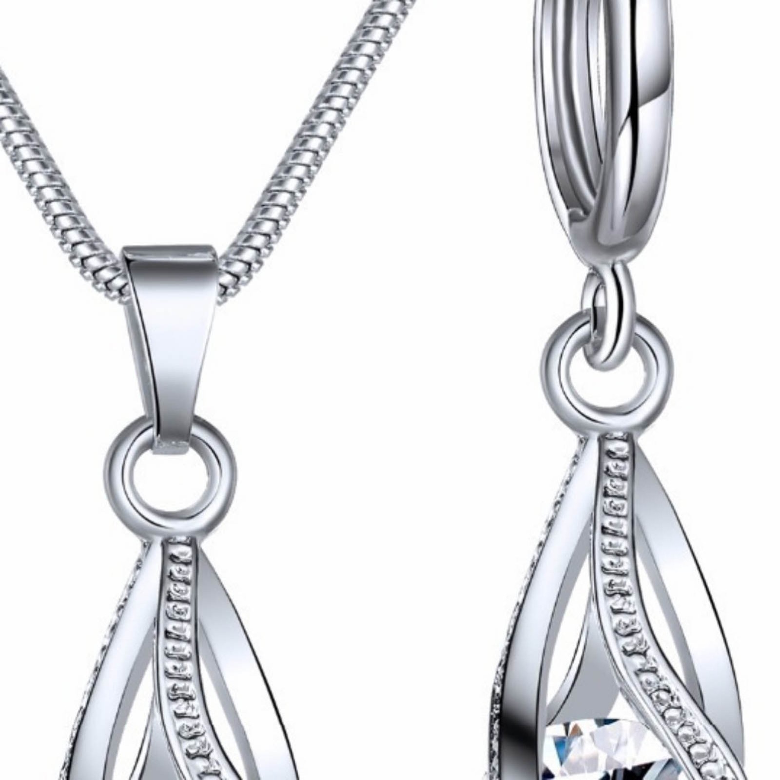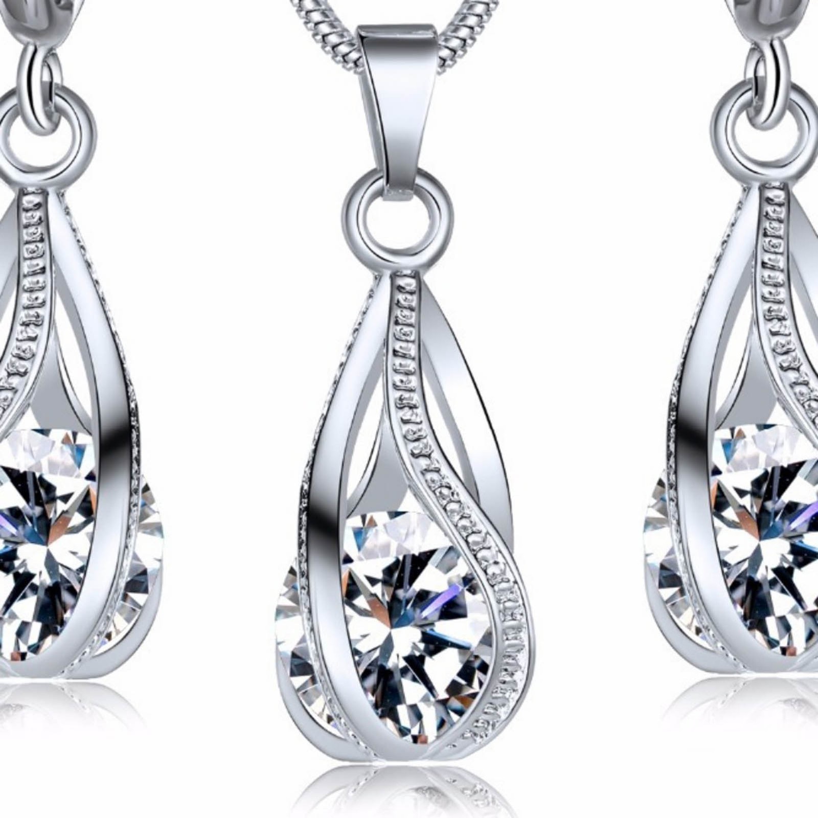 Silver Crystal Pear Drop Pendant Necklace And Earring Set