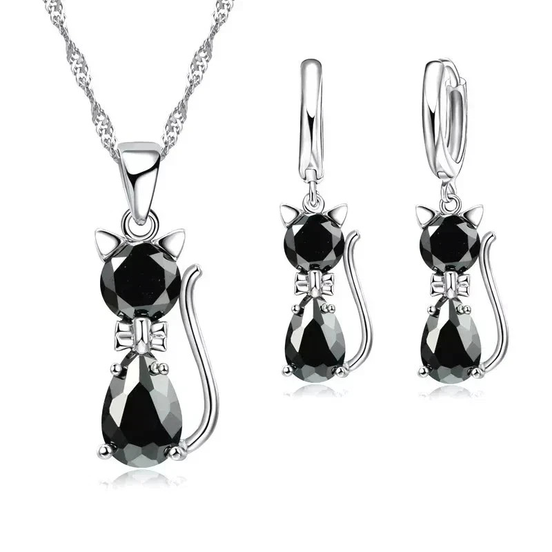 925 Sterling Silver Black Cat Kitten Crystal Pendant Necklace and Earring Set UK