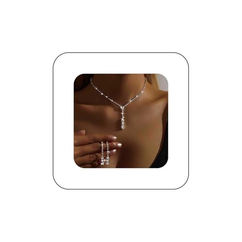 Wedding Necklace and Earring Set Silver Long Rhinestone Dangle Earrings Diamond Cubic Zirconia Bridal Chain Sparkly Crystal Tiny Y Drop Lariat Cz Pendant Choker Statement Bridesmaid Women Prom Party