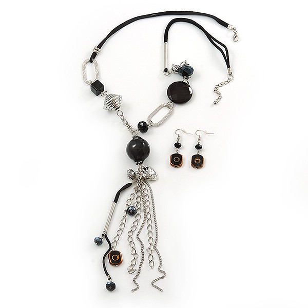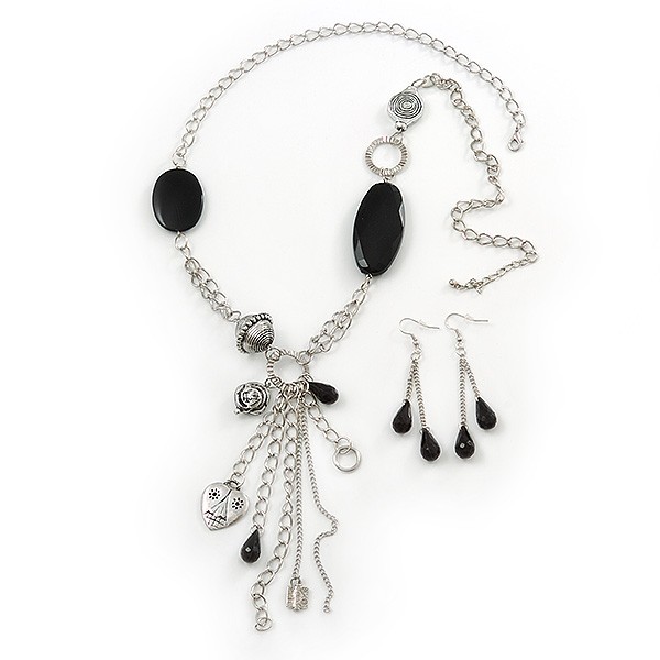 Long Black Resin Nugget Tassel Necklace and Earring Set In Silver Tone - 64cm