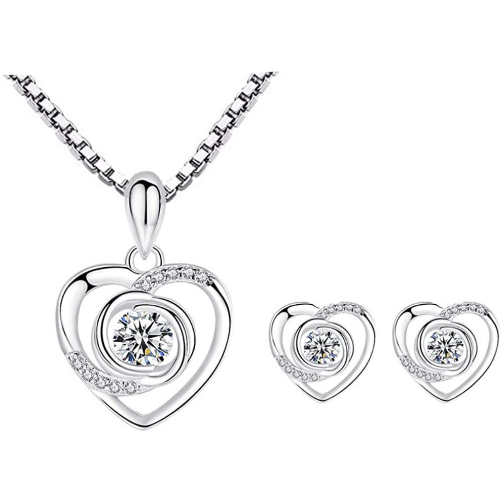Zirconia Double Heart Shaped Silver Plated Jewel Set, Necklace And Earring Jewelry Sets For Elegant, Set Women()