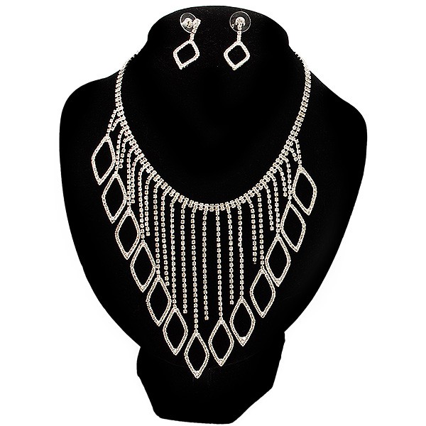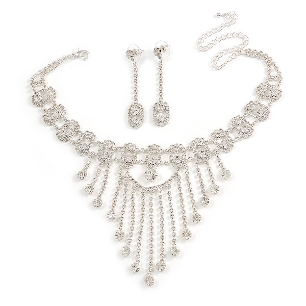 Divine Extravagance Crystal Bib Necklace And Dangle Earring Set (Silver Tone)