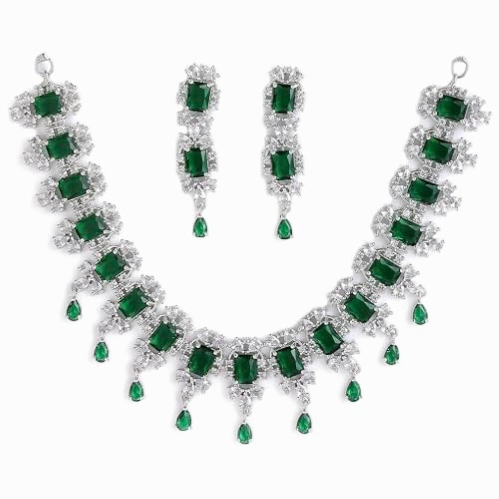 Rhodium-Plated Silver Toned Square Shaped American Diamond Studded Necklace with Earring Jewellery Set for and ()