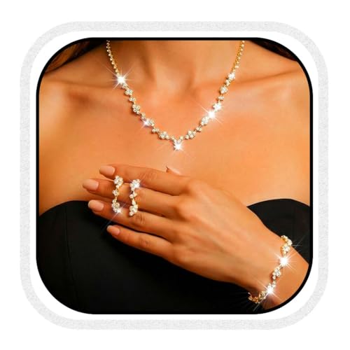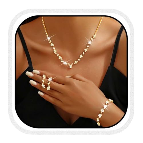 Reaky Bridal Jewelry Sets Silver Rhinestone Necklace Set 4 Pcs Crystal Earring and Necklaces Wedding Jewellery for Women (Gold)