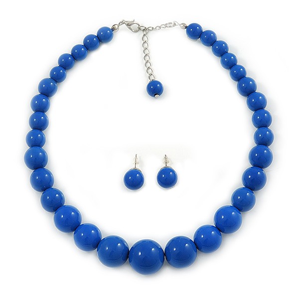 Imperial Blue Acrylic Bead Choker Style Necklace And Stud Earring Set In Silver