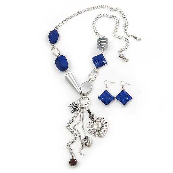 Long Blue Resin Nugget Tassel Necklace and Earring Set In Silver Tone - 78cm