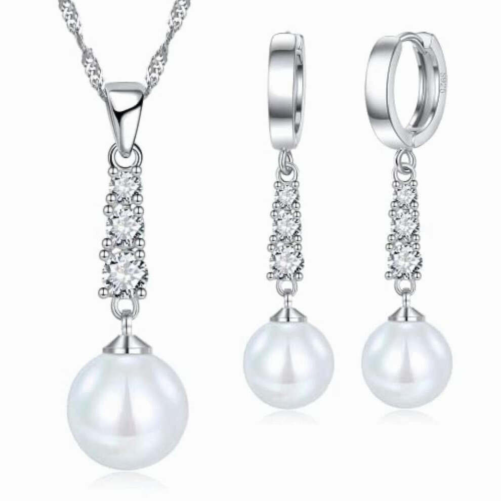 Silver Plated Pearl Dangle Pendant Necklace And Earring Jewellery Set, With Inlaid Zirconia, Drop Dangled Hoop Earring, Twist Rope Clavicle