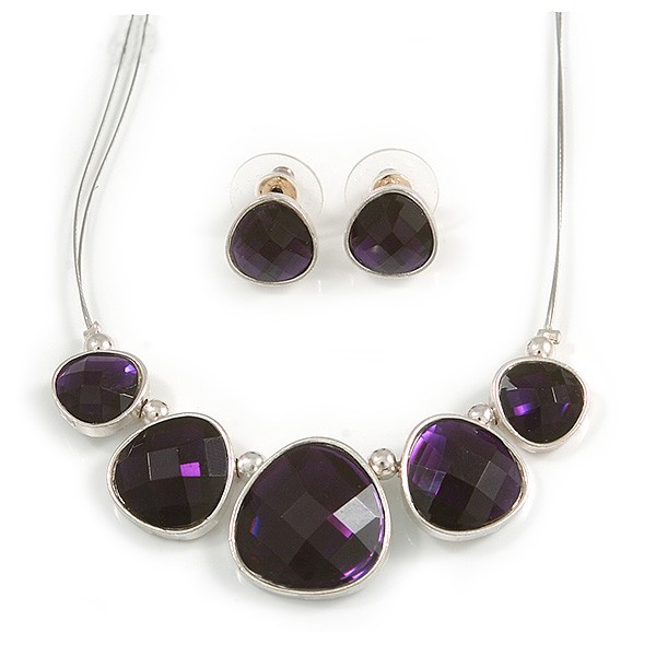 Deep Purple Diamante Wire Necklace And Stud Earring Set (Silver Tone Metal) -