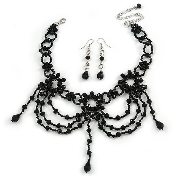Black Glass Bead Gothic Costume Choker Necklace And Earring Set In Silver