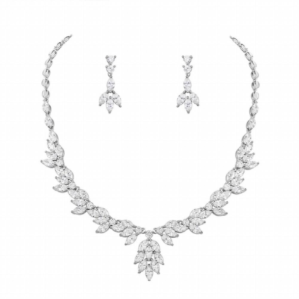 Rhodium Silver Plated Marquise Leaf Shape Cubic Zirconia Necklace and Drop Earring Bridal Jewelry Set