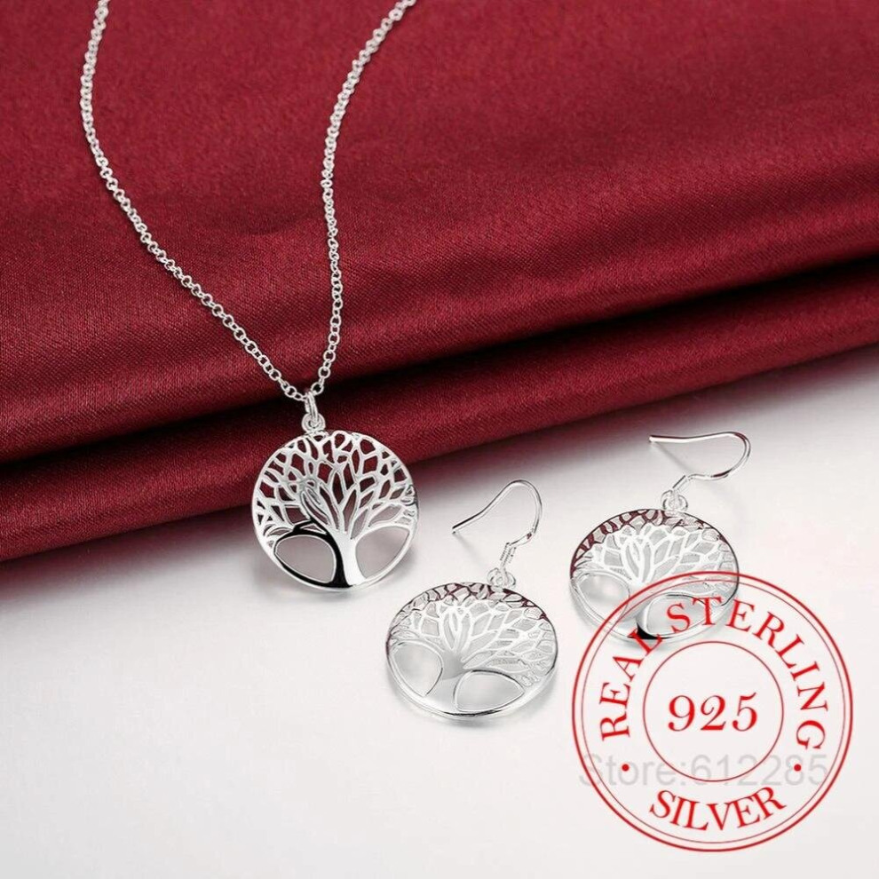 Wisdom Tree Necklace Earring Set 925 Sterling Silver Tree of Life Pendant Necklace and Earrings Christmas 2pcs Jewelry Set