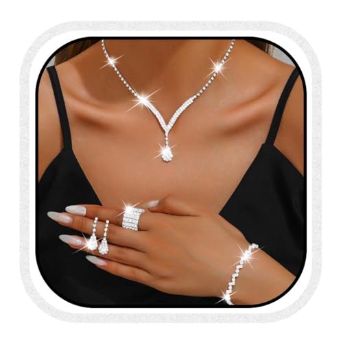 Reaky Bridal Jewelry Set Silver Necklace and Earring Sets 4 Pcs Rhinestone Wedding Jewellery Accessories for Women (Silver)