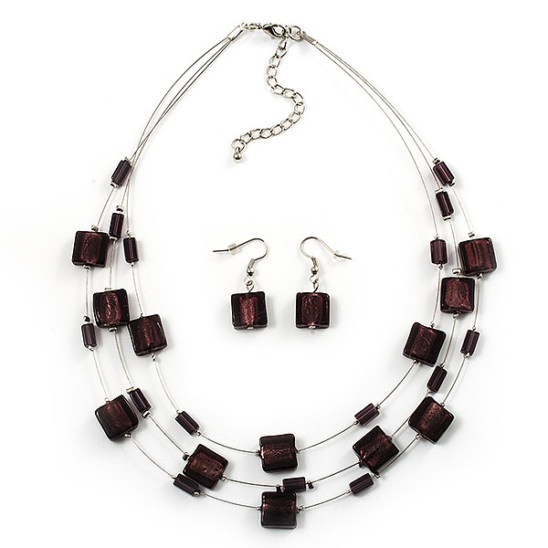 3 Strand Purple Glass Bead Wire Necklace And Drop Earring Set (Silver Tone)