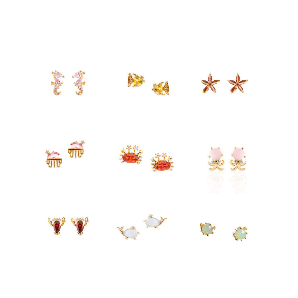 9 pair/set 925 Silver Seabed Small Animal Earrings Set for Women Colorful Zircon Piercing Earring set