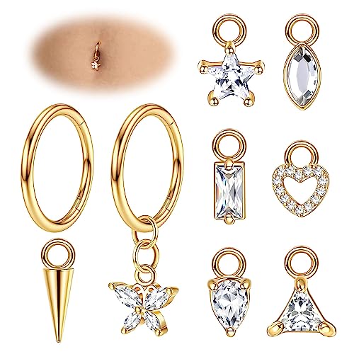 ADRAMATA 14G Dangly Belly Button Bars Surgical Steel Belly Button Piercing Gold Silver Hoop Earring Piercing Set Clicker Dangle Belly Ring Belly Bars Belly Piercing Body Piercing Jewellery for Women