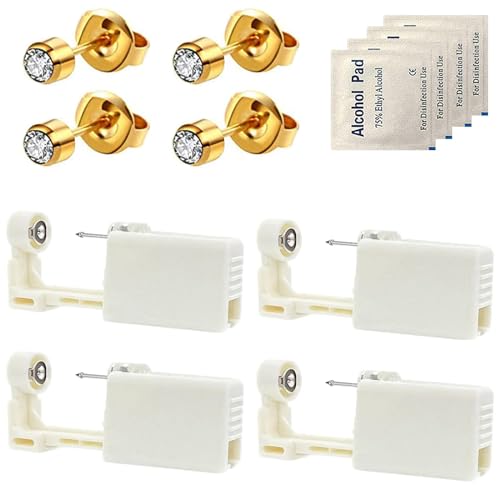 Dzxin Piercing Kits, 4 pcs Self Ear Piercing Gun, Disposable Self Ear Piercing Gun Kit with Earring Studs, Safety Ear Nose Piercing Gun Kit Tool (Golden- White)