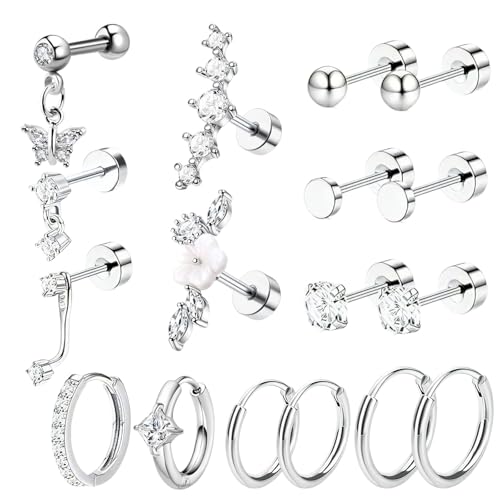 EOAMGO Cartilage Earrings Helix Piercing Jewellery, 12PCS Surgical Stainless Steel Tragus Ear Piercing Kit, Flat Back Stud Hoop Earrings for Women, Stackable Earring Sets for Multiple Piercings