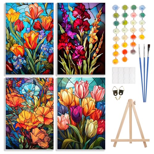 4 Pack Paint by Number Kits for Adults with Framed Canvas&Wooden Easel, DIY Adult Painting by Number Kit Oil Acrylic, Flower Painting by Number for Beginners, Arts and Crafts for Home Decor 8x12inch