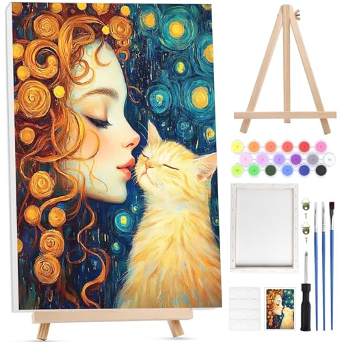 Bowetile Elegant Woman and Cat Paint by Numbers for Adults with Framed Canvas&Wooden Easel, Painting by Numbers for Beginners Canvas Kit,DIY Acrylic Pigment Drawing Paintwork for Home Decor30x40cm