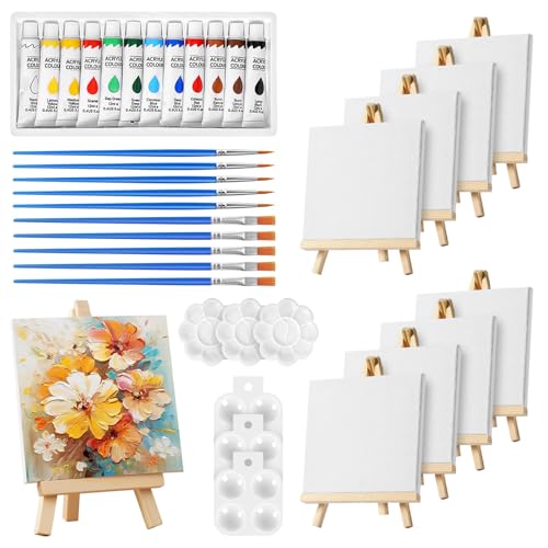 Obidodi Mini Canvas and Easel Set, 44 Pcs Painting Set Includes 4x4 Inches Canvas, Wooden Mini Easel, Acrylic Paint, Brushes and Palette for Kids, Sip and Paint Party for Adults Kids