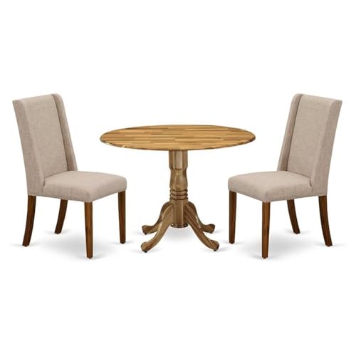 East West Furniture DLFL3-ANA-04 3 Piece Dining Table Set Contains a Round Dining Room Table with Dropleaf and 2 Light Tan Linen Fabric Upholstered Chairs, 42x42 Inch, Natural