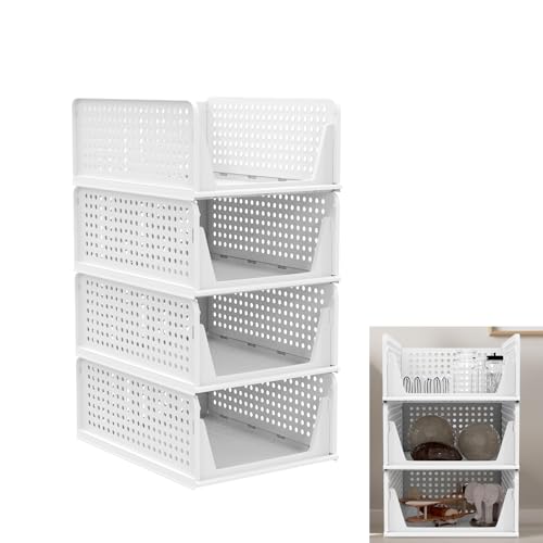 AUTOFU Wardrobe Storage Organiser, 4 Pack Folding Closet Organisers, PP Plastic Stackable Storage Boxes for Shelves, Easy Pull Out Drawer Organizer Basket for Home, Bedroom, Kitchen, White (Set of 4)