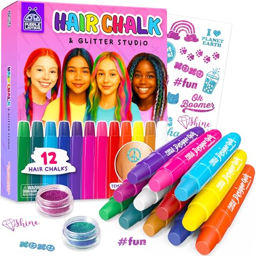 Purple Ladybug 12 Vibrant Colour Hair Chalks for Girls with Glitter Tattoos | Easy Wash Out | Safe Non-Toxic Temporary Hair Colour for Kids | Birthday Gift for Kids & Teens