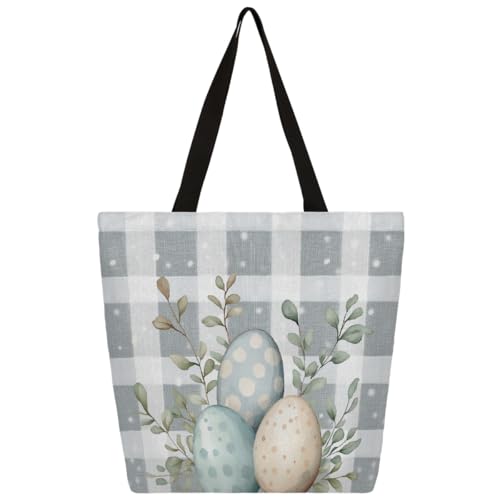 Entemne Women's Large Canvas Tote Bag Easter Eggs Eucalyptus Leaves Plaid Grocery Bag with Zipper Pocket Reusable Eco-Friendly Shopping Shoulder Bag for Work Travel Everyday Use