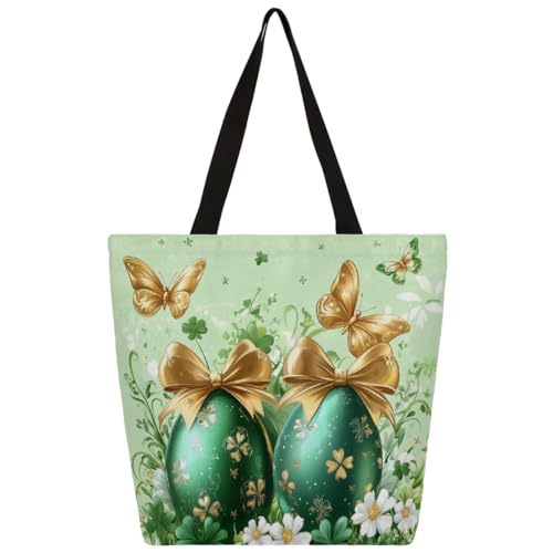 Entemne Women's Large Canvas Tote Bag Easter Eggs Gold Bows Butterfly Spring Grocery Bag with Zipper Pocket Reusable Eco-Friendly Shopping Shoulder Bag for Work Travel Everyday Use