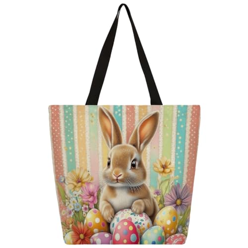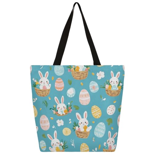 Entemne Women's Large Canvas Tote Bag Cute Easter Bunny Rabbit Eggs Grocery Bag with Zipper Pocket Reusable Eco-Friendly Shopping Shoulder Bag for Work Travel Everyday Use