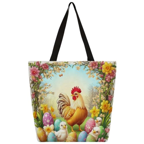 Entemne Women's Large Canvas Tote Bag Easter Rooster Chicken Eggs Flowers Grocery Bag with Zipper Pocket Reusable Eco-Friendly Shopping Shoulder Bag for Work Travel Everyday Use
