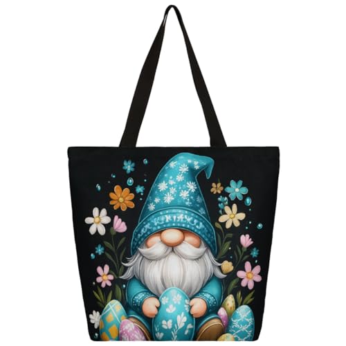 Entemne Women's Large Canvas Tote Bag Cartoon Easter Gnomes Eggs Grocery Bag with Zipper Pocket Reusable Eco-Friendly Shopping Shoulder Bag for Work Travel Everyday Use