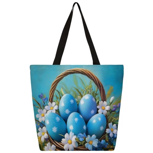 Entemne Women's Large Canvas Tote Bag Blue Easter Eggs Spring Flowers Grocery Bag with Zipper Pocket Reusable Eco-Friendly Shopping Shoulder Bag for Work Travel Everyday Use