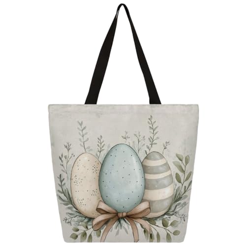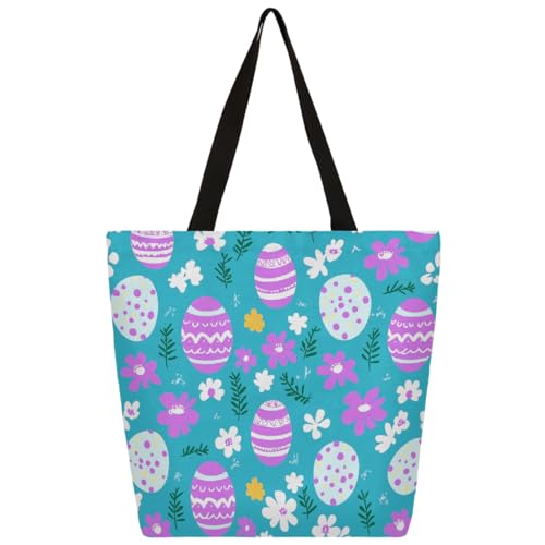 Entemne Women's Large Canvas Tote Bag Easter Printing Eggs Pattern Grocery Bag with Zipper Pocket Reusable Eco-Friendly Shopping Shoulder Bag for Work Travel Everyday Use