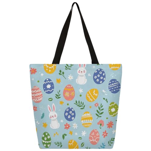 Entemne Women's Large Canvas Tote Bag Easter Eggs Rabbit Grocery Bag with Zipper Pocket Reusable Eco-Friendly Shopping Shoulder Bag for Work Travel Everyday Use