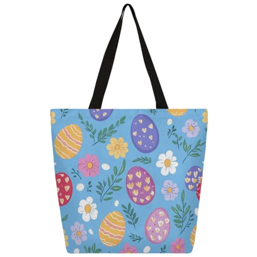 Entemne Women's Large Canvas Tote Bag Easter Eggs Flowers Pattern Grocery Bag with Zipper Pocket Reusable Eco-Friendly Shopping Shoulder Bag for Work Travel Everyday Use
