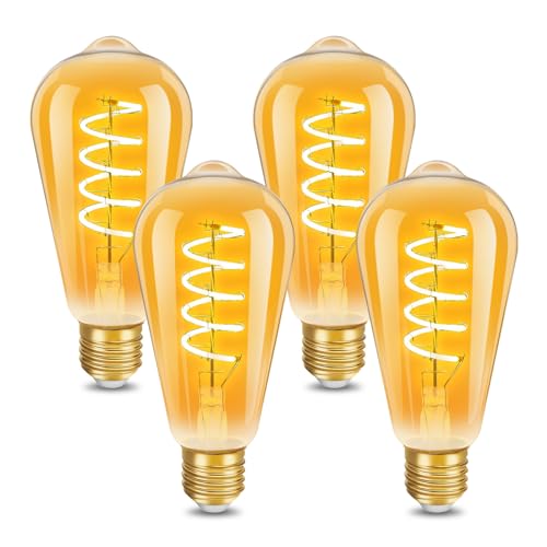 ILEEDear Vintage Edison Light Bulb ST64 Spiral Flexible LED Filament Bulbs, 4W Equivalent to 32W, Retro Amber Glass Screw Lamp, Warm White 2200K, Energy Saving Light Bulbs, Non-dimmable, Pack of 4