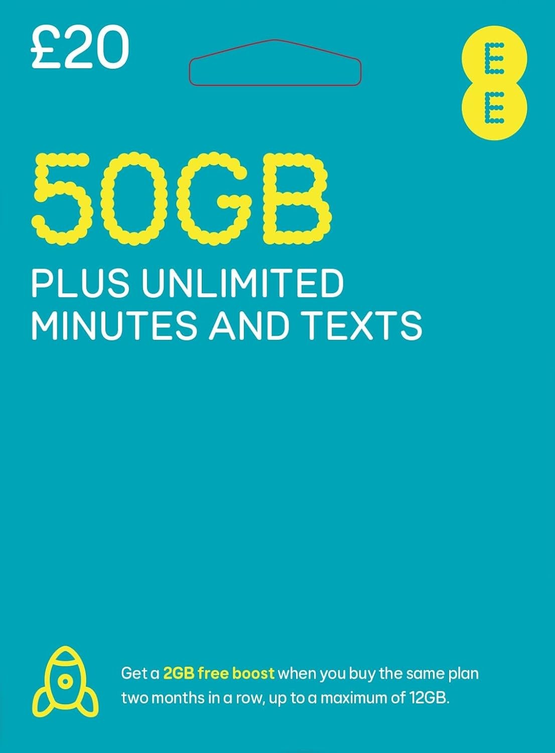 EE 50GB Data Sim includes £20 pre-paid credit, 50GB Data, Unlimited Minutes & Unlimited Texts