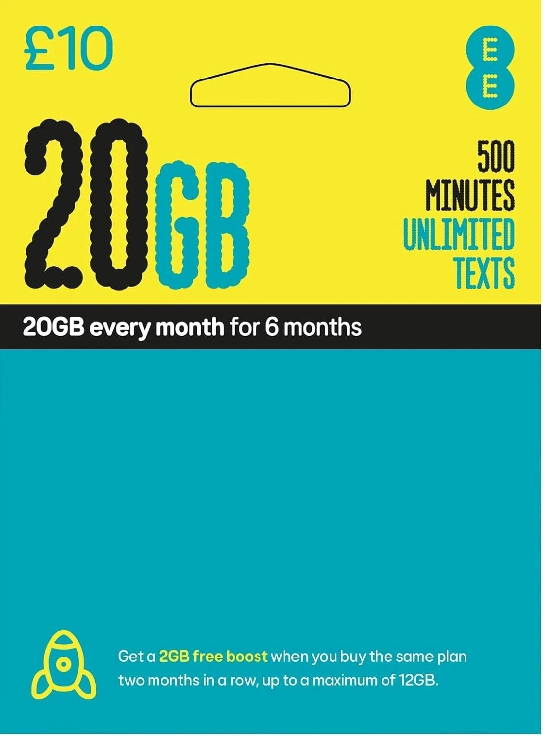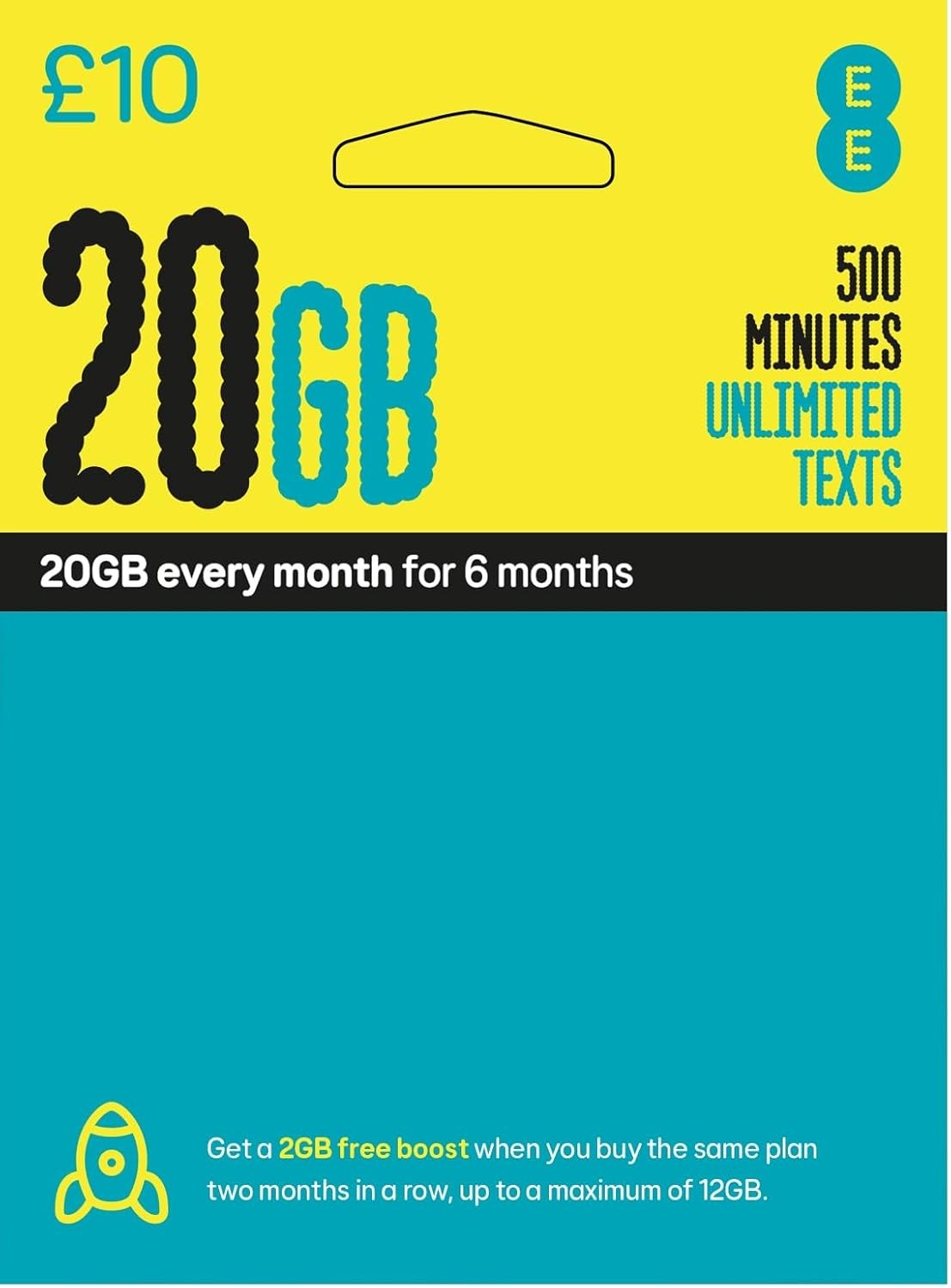 EE PAYG £10 Data Sim Includes £10 pre-paid credit, 20GB Data, 500 Minutes and Unlimited Texts (EE £10-20GB)