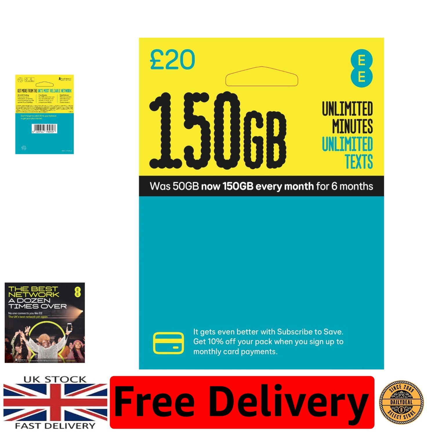 EE 150GB Data Sim includes 20 pre-paid credit, 150GB Data, Unlimited Minutes & Unlimited Texts
